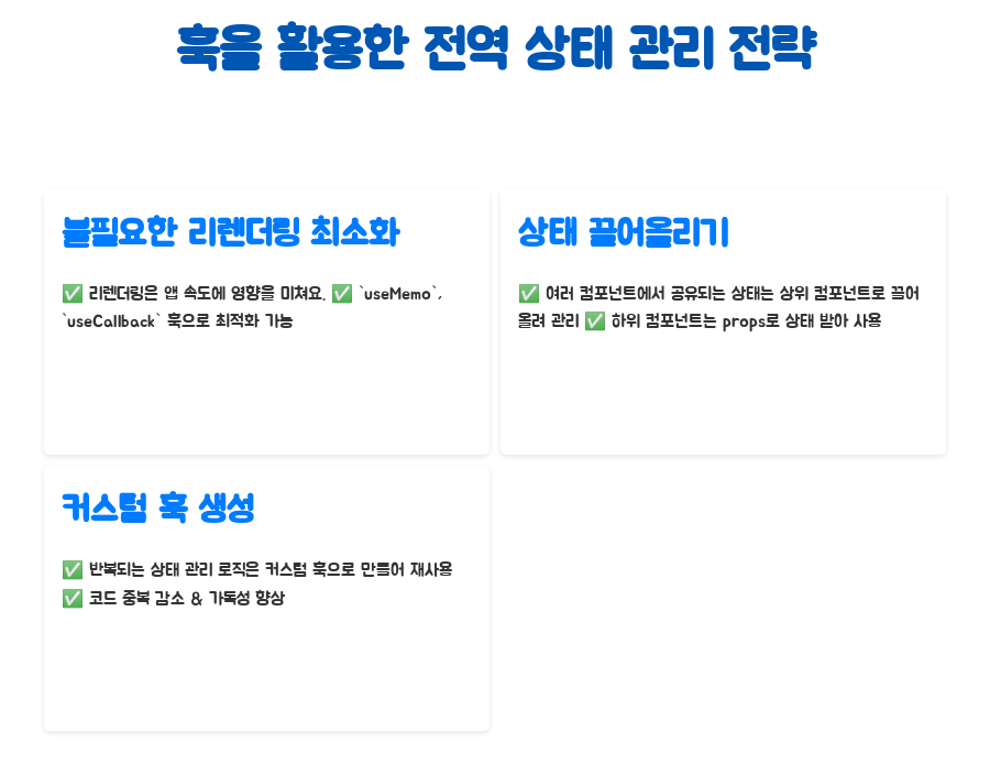 훅을 사용해서 전역 상태를 관리할 때, 몇 가지 전략을 활용하면 더욱 효율적으로 관리할 수 있어요.