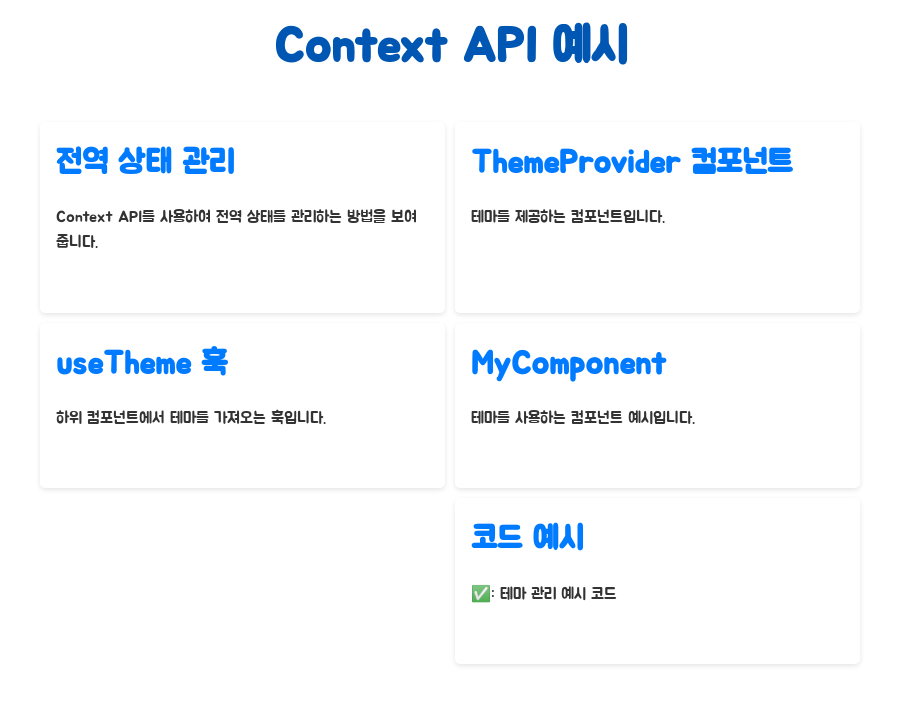 실제로 Context API를 사용해서 전역 상태를 관리하는 예시를 보여드릴게요. 아래 코드는 테마를 전역적으로 관리하는 예시인데요, 컴포넌트에서 테마를 제공하고, 하위 컴포넌트들은 훅을 이용해서 테마를 가져다 쓸 수 있어요.