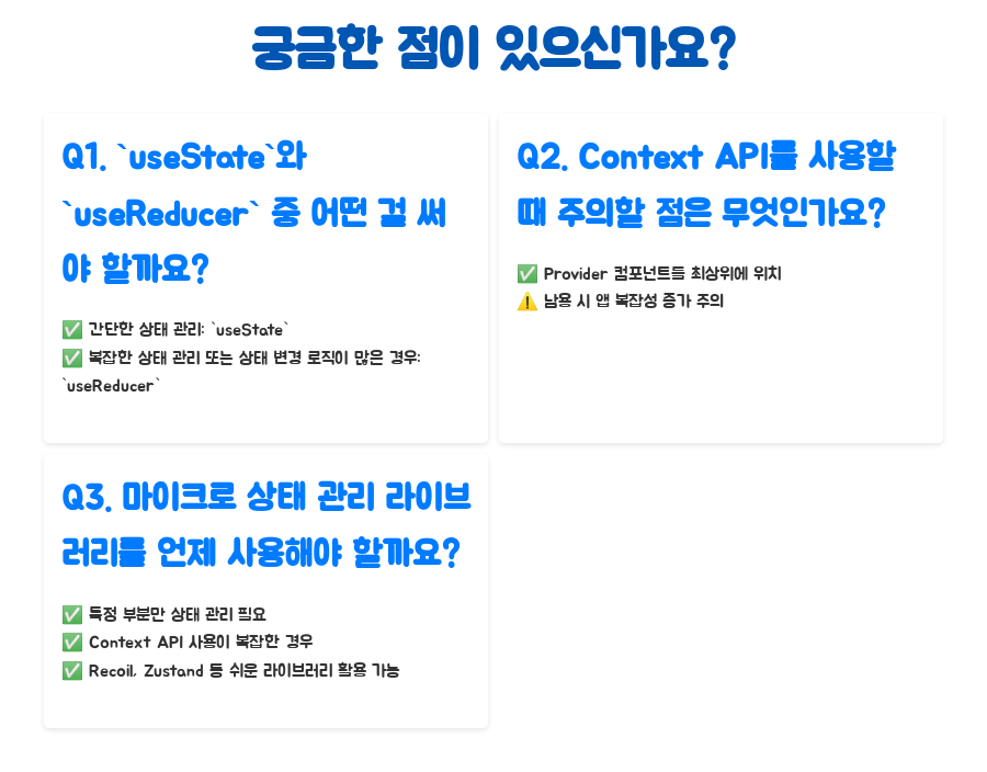 A2. Context API를 사용할 때는 Provider 컴포넌트를 최상위 컴포넌트에 위치시키는 게 좋아요. 그래야 하위 컴포넌트들이 Context를 쉽게 접근할 수 있답니다. 또한, Context API를 너무 남용하면 오히려 앱의 복잡성이 증가할 수 있으니, 신중하게 사용하는 게 좋답니다.