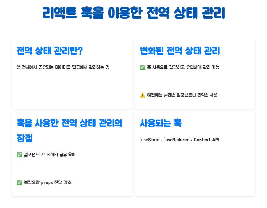 전역 상태 관리, 쉽게 말해 앱 전체에서 공유되는 데이터를 한곳에서 관리하는 거예요. 예전엔 클래스 컴포넌트나 리덕스 같은 외부 라이브러리를 써서 했는데, 훅이 등장하면서 세상이 달라졌죠. 훅을 이용하면 훨씬 간결하고 유연하게 전역 상태를 다룰 수 있게 되었거든요.