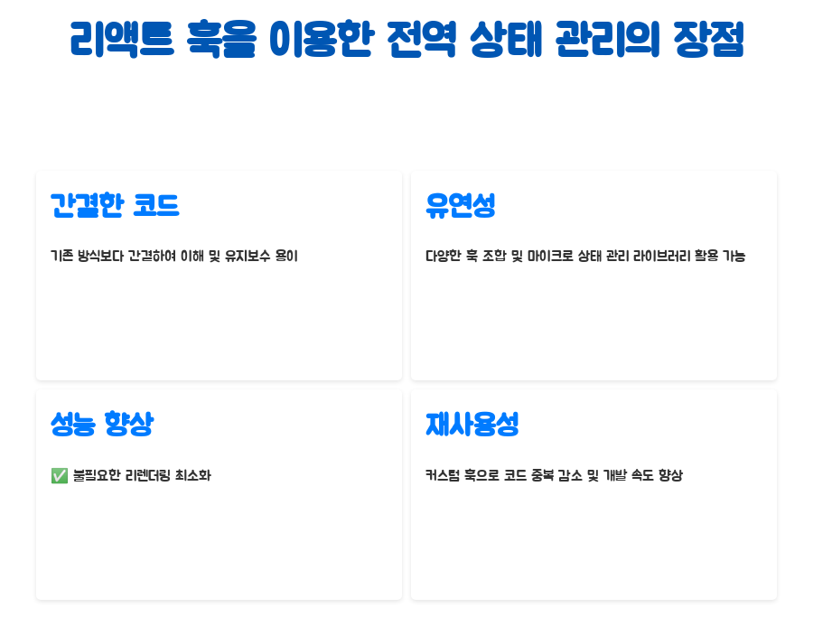 리액트에서 훅을 이용한 전역 상태 관리는 몇 가지 장점을 가지고 있어요.