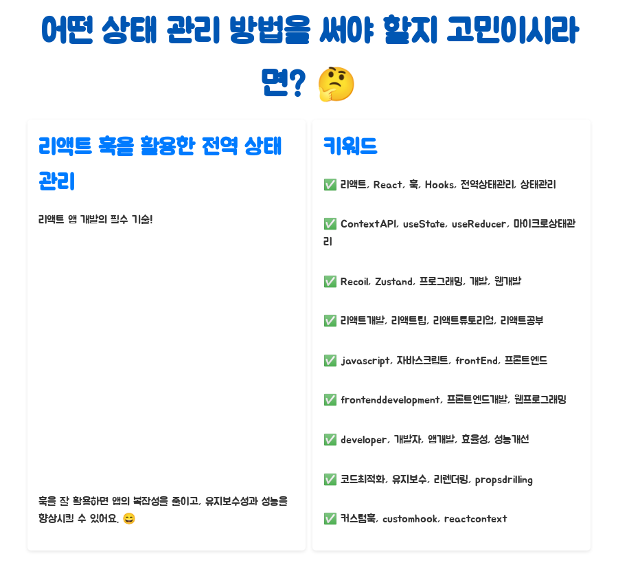 키워드:리액트,React,훅,Hooks,전역상태관리,상태관리,ContextAPI,useState,useReducer,마이크로상태관리,Recoil,Zustand,프로그래밍,개발,웹개발,리액트개발,리액트팁,리액트튜토리얼,리액트공부,javascript,자바스크립트,frontEnd,프론트엔드,frontenddevelopment,프론트엔드개발,웹프로그래밍,developer,개발자,앱개발,효율성,성능개선,코드최적화,유지보수,리렌더링,propsdrilling,커스텀훅,customhook,reactcontext